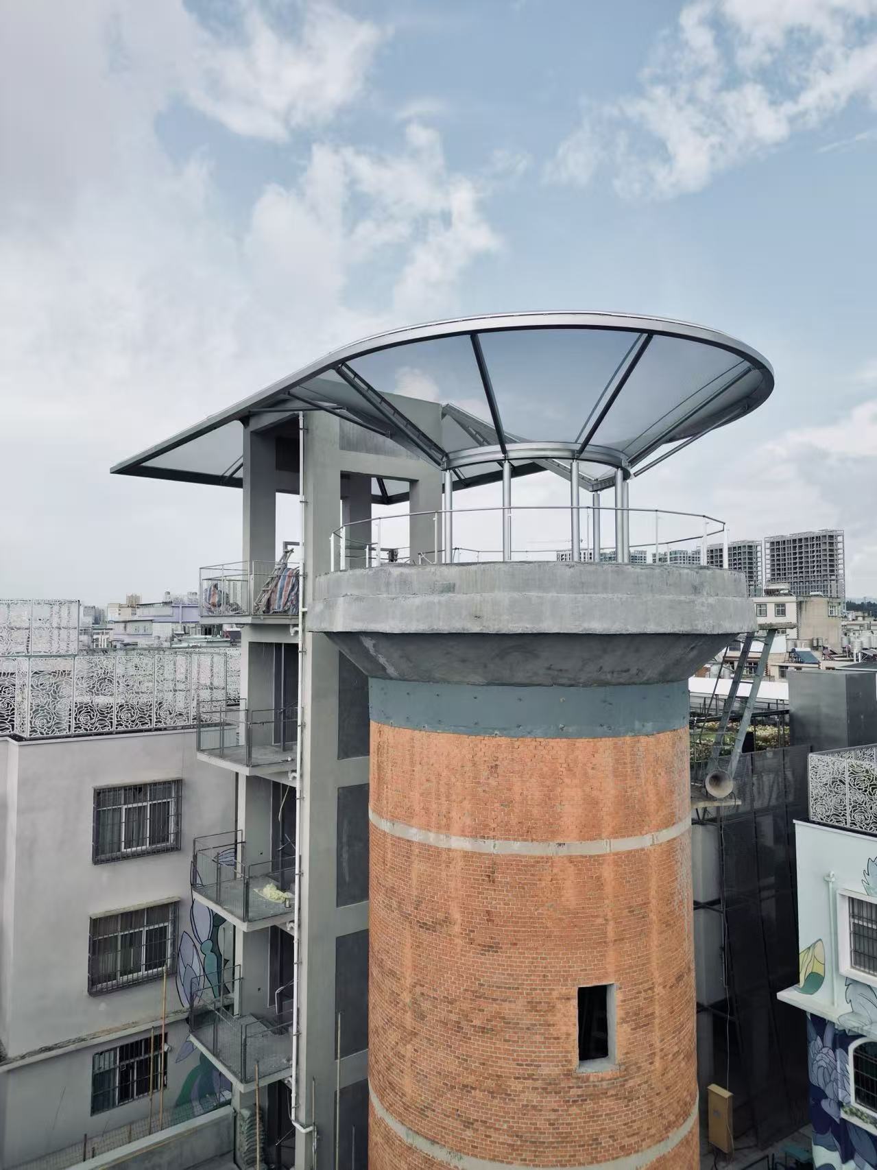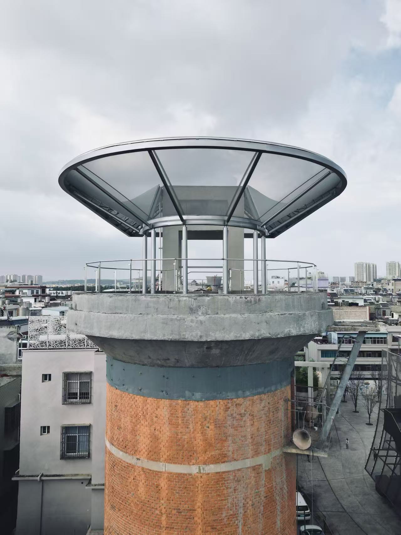 A new vertical stair tower is added beside the water tower to meet contemporary access and safety requirements. Between the old and the new, a pavilion is suspended as a connector and shared platform—an interface where “new and old” coexist and support one another.