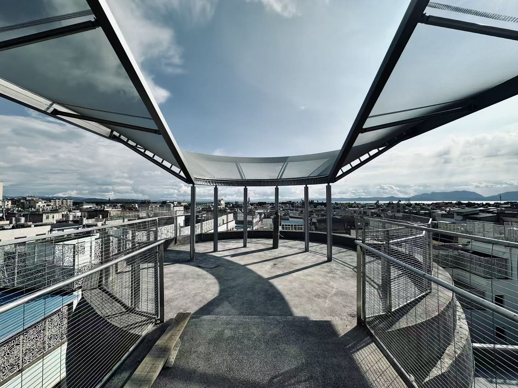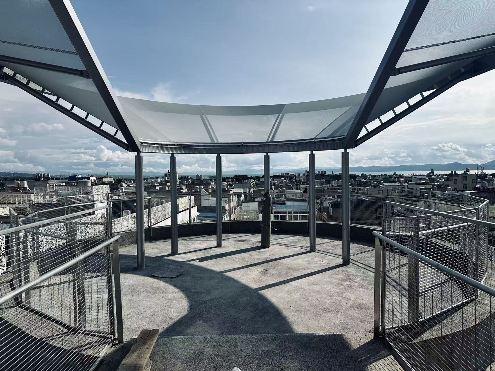 To minimize intervention and protect the existing tower, the pavilion adopts a lightweight membrane system and slender structure, reducing additional load on the historic fabric. The canopy provides shade and shelter while maintaining openness, emphasizing air, light, and the expansive horizon.